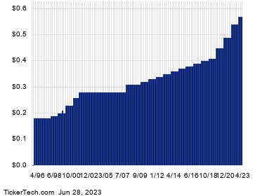 A bullish investor could look at BMY’s 28.8 RSI reading today as a sign that the recent heavy selling is in the process of exhausting itself, and begin to look for entry point opportunities on the buy side. Among the fundamental datapoints dividend investors should investigate to decide if they are bullish on BMY is its dividend history. In general, dividends are not always predictable; but, looking at the history chart below can help in judging whether the most recent dividend is likely to continue.