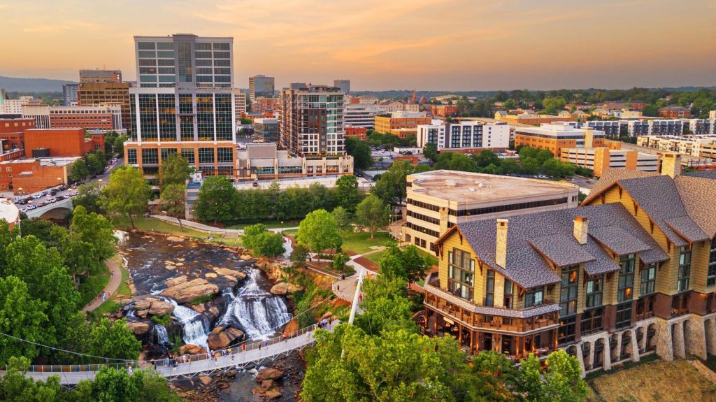 Hilly college town (Furman University, Bob Jones University) of 75,000 in South Carolina’s Blue Ridge Mountains region, midway between Atlanta and Charlotte.